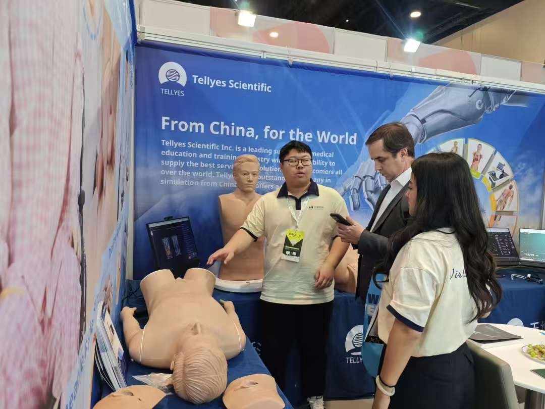 Tellyes team made a splendid appearance at Booth S3.B113, showcasing a range of high-end intelligent simulators including MULAN-Multifunction Patient Simulator, Althea Nursing, SP Brothers-Standardized Patient Brothers, Complete Childbirth Simulator (Twins), and DefibReady. On the very first day, our booth attracted over a hundred experts from more than 40 countries and regions for visits and hands-on experiences.